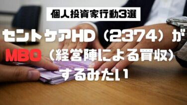 投資セントケアHD(2374)がMBO(経営陣による買収)するみたい【個人投資家行動3選】 ※本記事はアフェリエイト広告を利用しています。セントケアHD(2374)がMBO(経営陣による買収)するみたいMBOとなった株式で個人投資家が取るべき行動は3つSBI証券で”株式公開買付の申し込み”の手順※SBI証券口座で保有の場合セントケ... 2025.11.16投資