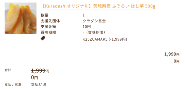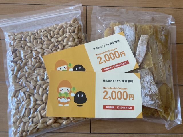 クラダシ(5884)の株主優待(クーポン券2,000円×2枚)で、ピーナッツと干し芋を購入しました。