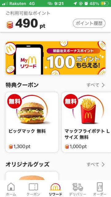クーポンもあるので、マックを食べるつもりなら積極的に使っていきたいですね。それに、初回注文であれば、100ptも貰えちゃえます。