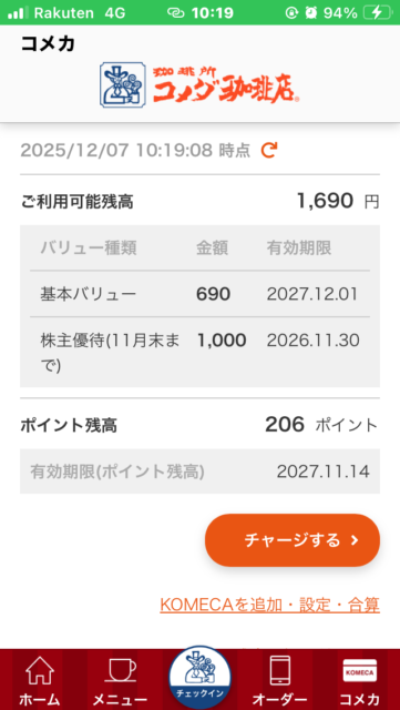 上記の中だと、唯一「コメダホールディングス」の株を保有しているので、直近で「KOMECA」1,000円分貰いました。