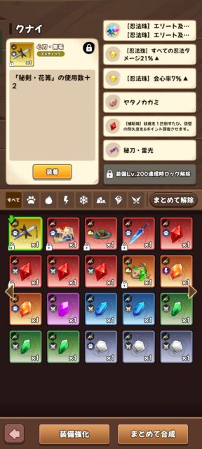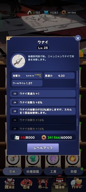 「クナイ特化育成を失敗」した後ですが、無事にクナイLv.25まで上げることができました。