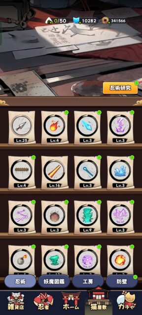 いつかのアップデートで、強化先のある忍術には下にアイコンが表示されるようになりました。