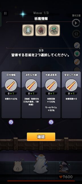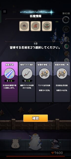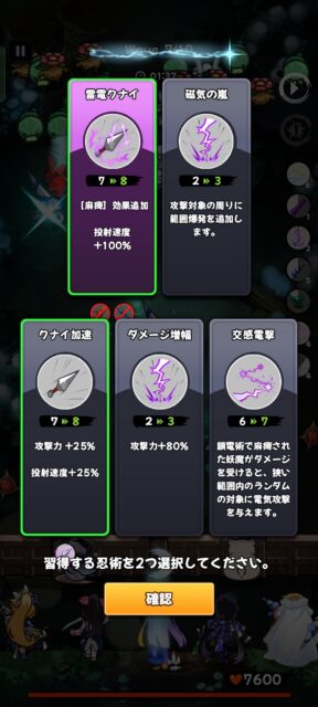 今の私は特装メイを使っているので、日光術「陽電子砲」やクナイ術「雷電クナイ」をよく選んでいる。