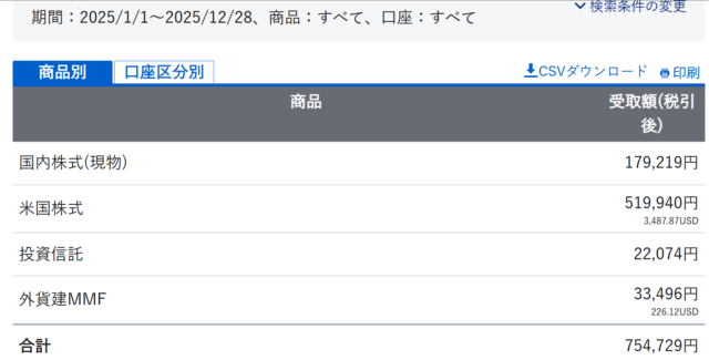 SBI証券では、税引き後で754,729円。楽天証券では、84,046円(元本払戻金を含む)+43.94ドルでした。(期間:2025/1/1~12/28)