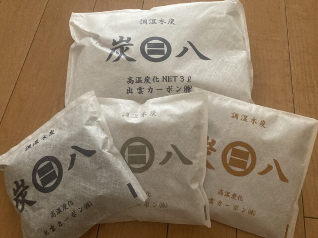 月一ぐらいで天日干しすることで、半永久的に使えるらしい”調湿木炭”の「炭八」です。