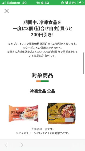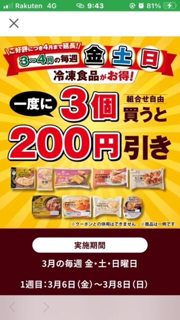 そう言えば、セブンが3~4月の毎週金土日で冷凍食品3個買うと200円引きをしています。