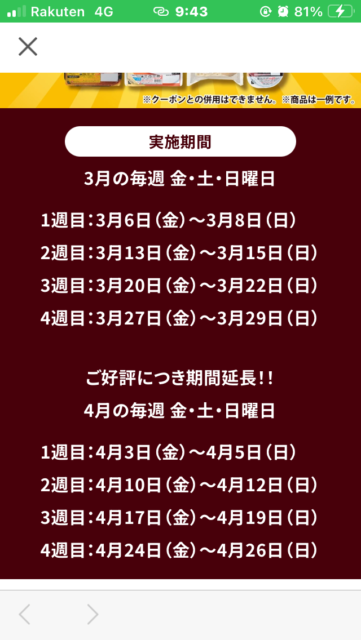 あと、4月の毎週土曜日にお菓子無料クーポン配布もやっているみたいです。